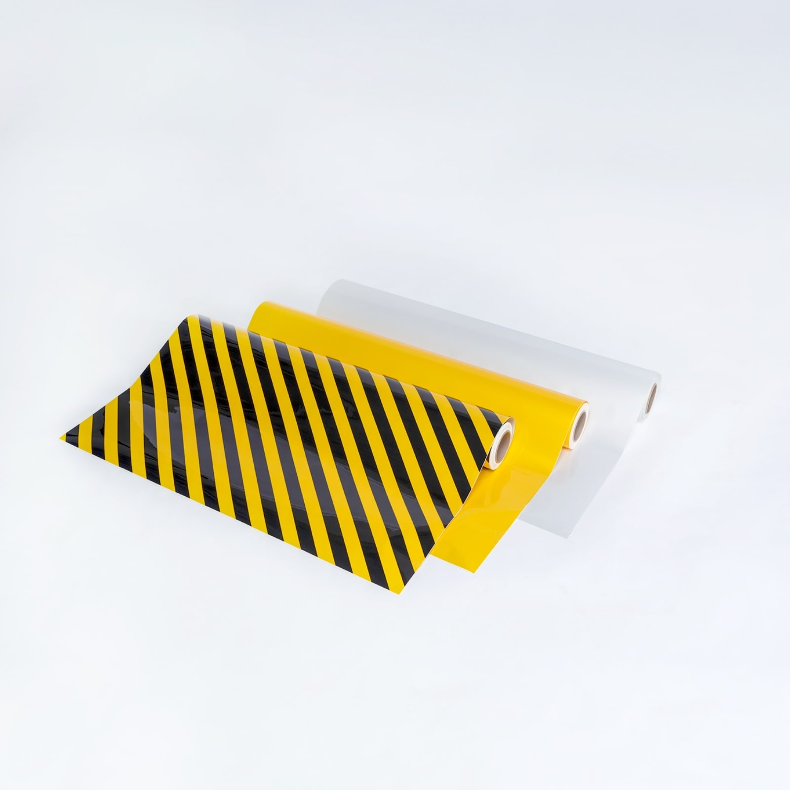 歩行帯を「塗る」から「貼る」へ 工場や施設の床に綺麗に長持ちする歩行帯を時短でつくる「超耐久歩行帯シート」です。