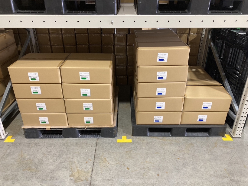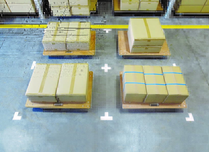 ③パレットや台車置き場の位置を示す「位置決めテープ」
