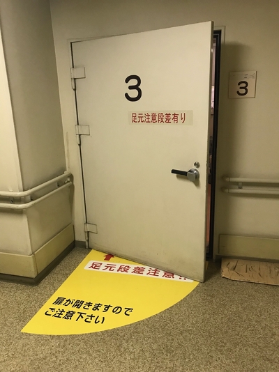 扉の前に衝突防止、段差注意喚起のための特注デザインシートを制作しました。