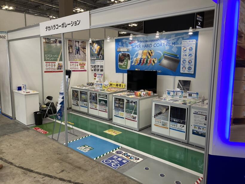 当社ブースでは、多用途粘着素材「ビバフィルム」シリーズを中心に、屋内外で使用可能なレボシートや高耐久テープ・ビバスーパーラインテープ、滑り止めテープ「ZARAX(ザラックス)」、各種注意喚起サイン、デザインシートなどを展示いたしました。
