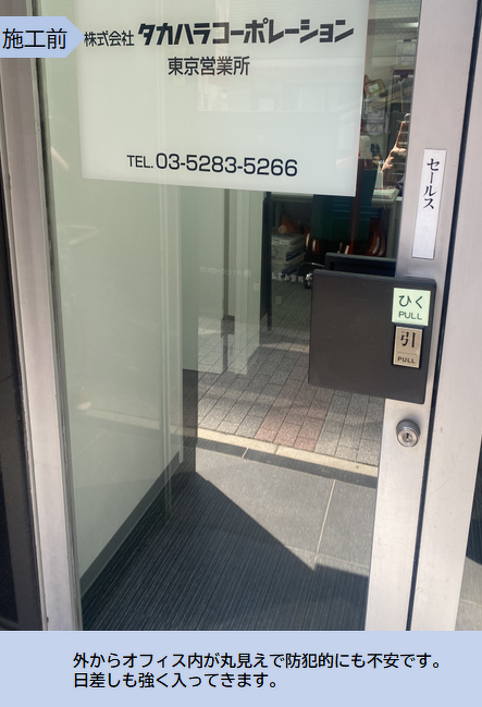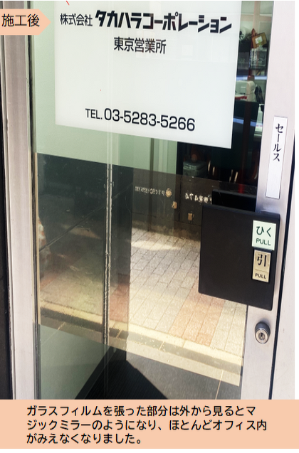 『オフィス入口ガラス部分』に遮熱効果が高いガラスフィルムを自身で貼ってみました!