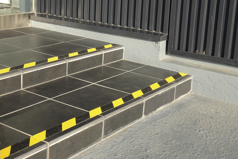 段差に気づかず転倒する事故を防ぐため、滑り止めテープを導入