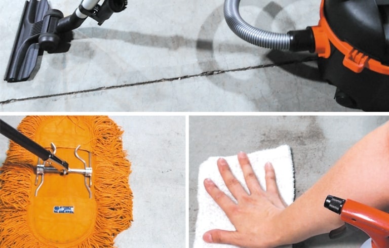 床面をキレイに掃除し、ホコリやチリなどを除去してラインテープを貼りやすくします。